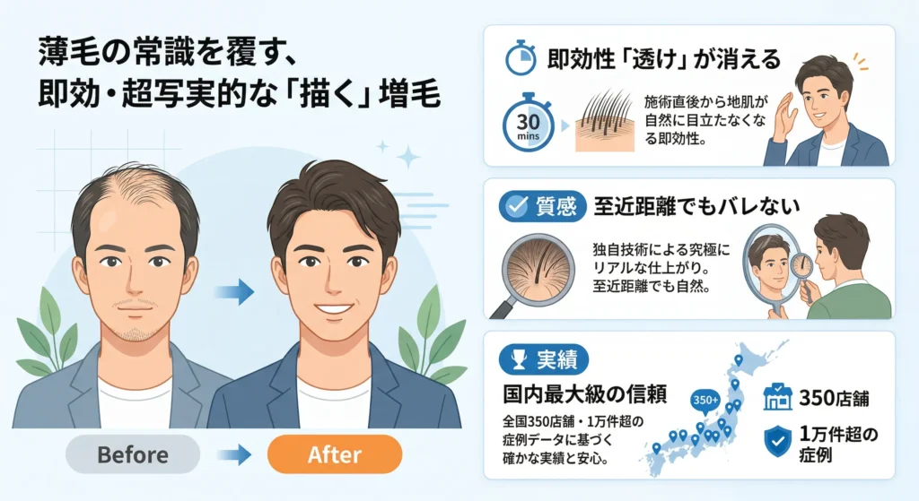 本記事では、10年以上のマーケティング経験に基づき、スカルプインクがなぜこれほど支持されているのかを第三者の視点で分析します。従来のヘアタトゥーにあった「不自然な青み」や「滲み」といった課題を克服し、地肌の透け感を極めてナチュラルにカバーするその技術力。そして、1回20,000円という継続しやすい価格設定についても深掘りします。全国350店舗で展開され、既に10,000件以上の症例実績を持つこのサービスが、あなたの外見的な不安をどう変えるのか、その全貌を中立的な立場からお届けします。
